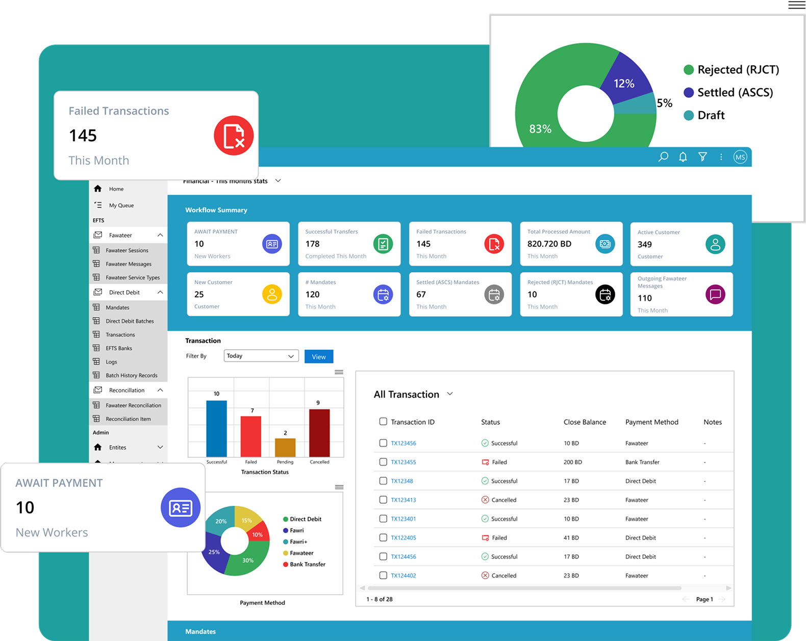 The EFTS Fawateer System dashboard offers an intuitive interface for monitoring and managing payment transactions in real-time. Key features include: